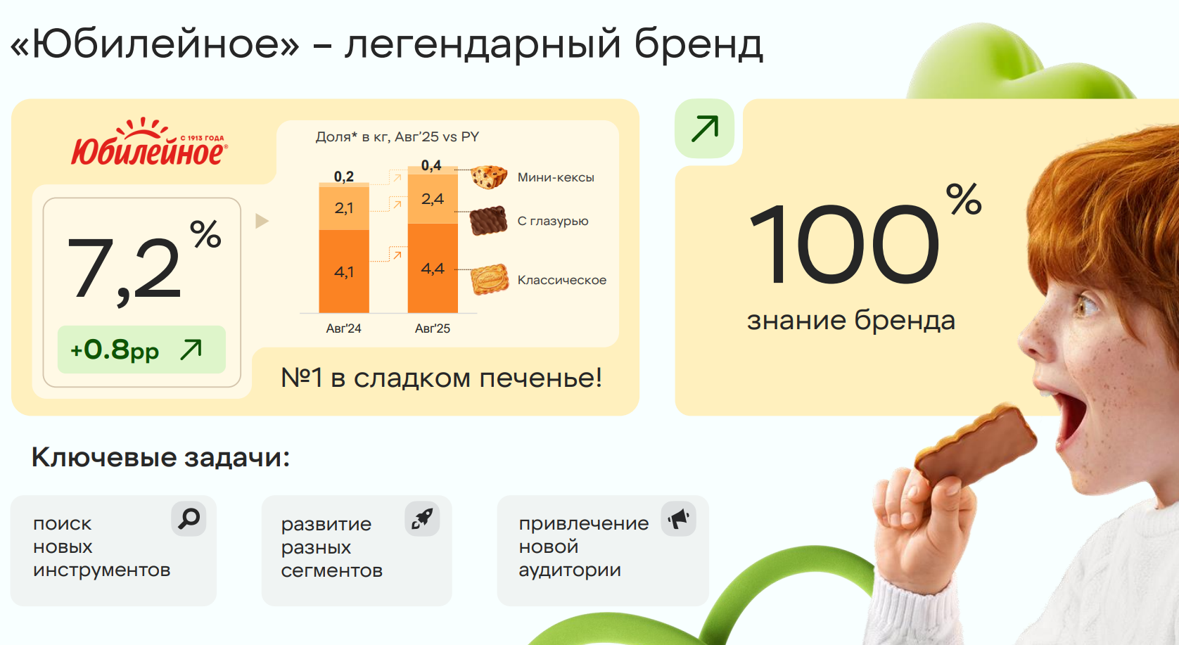 «Юбилейное» — один из самых узнаваемых брендов в сладком печенье. Он динамично развивается в разных сегментах категории и обладает высокой узнаваемостью среди массовой аудитории. Это важная отправная точка: когда бренд уже занимает лидерскую позицию, задачи формулируются иначе, чем у брендов, которые только набирают долю.