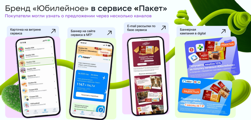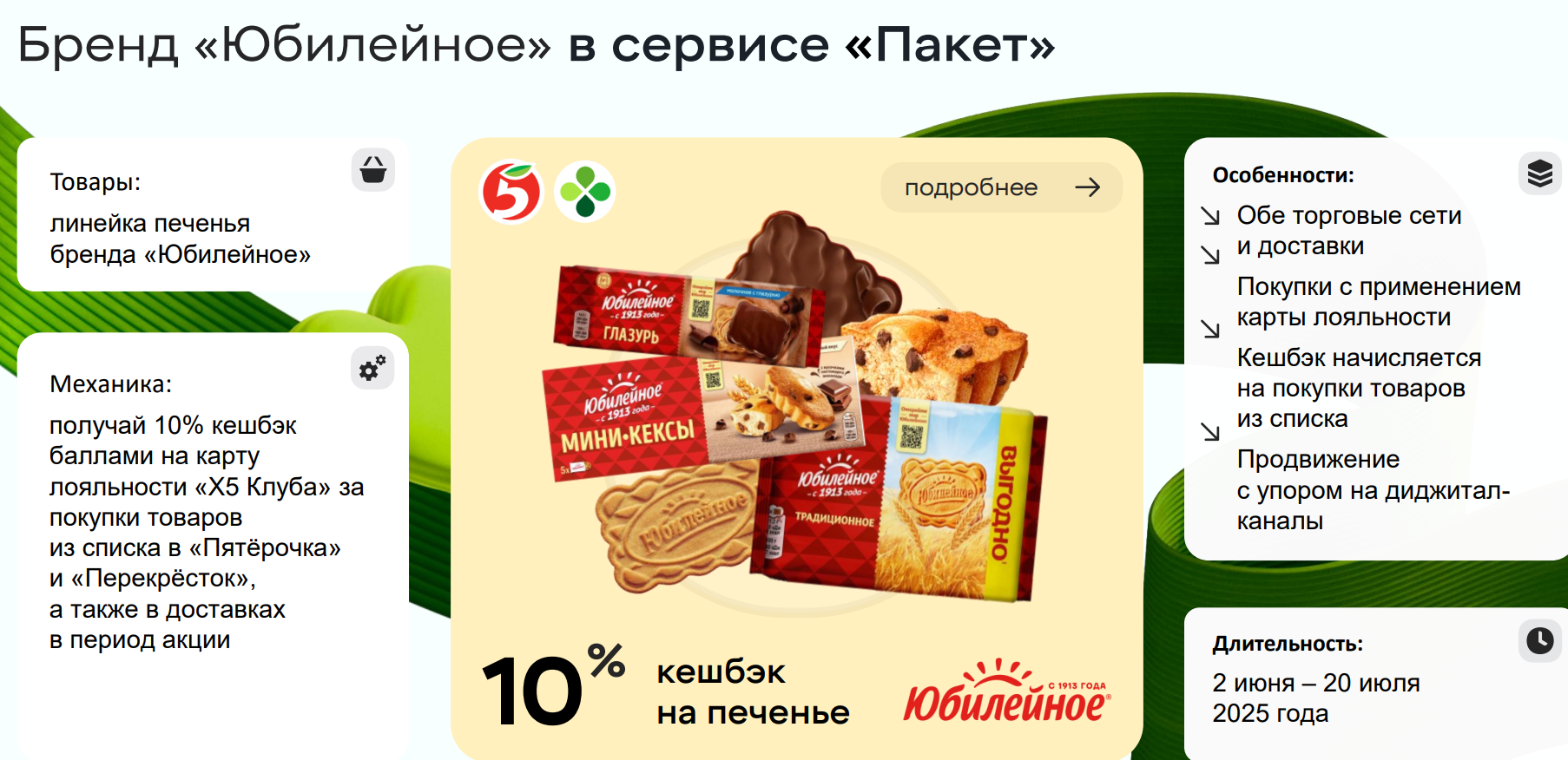 Рекламную кампанию по бренду «Юбилейное» запускали именно в этом контуре. В акции участвовали около 15 позиций из категории печенья и мини-кексов. Предложение для покупателя было сформулировано напрямую: 10% кэшбэк за покупку товаров «Юбилейное» из списка участников акции.