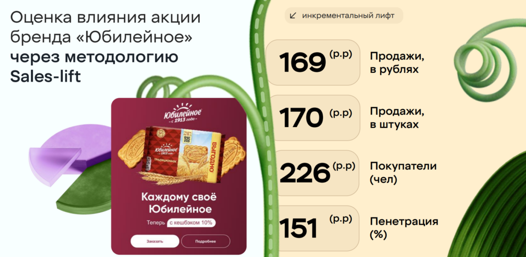 Аналитика подтвердила прирост в виде дополнительных инкрементальных продаж. При этом эффект был зафиксирован не только на уровне бренда «Юбилейное», но и на уровне категории в целом. Результаты измерялись как в денежном выражении, так и в натуральных показателях.