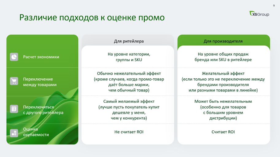 Существует разница в подходах поставщика и ритейлера при планировании и оценке промоакций. Производитель фокусируется на росте продаж своего бренда или конкретного SKU. Для X5 ключевым показателем успеха является рост всей товарной категории в целом.