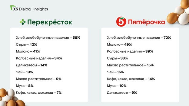 В сети «Перекрёсток» корзина с яйцами выглядит чуть иначе, хотя в целом сохраняется похожая логика. Лидируют хлеб и хлебобулочные изделия (56%), далее следуют сыры (42%), молоко (41%) и колбасные изделия (34%).