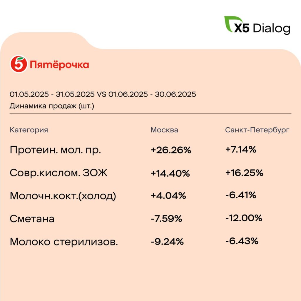 В московских и петербургских сетях «Пятёрочка» продолжается рост интереса к современным молочным продуктам. В Москве лидируют протеиновые позиции: рост продаж составил +26,26 %, в Санкт-Петербурге — +7,14 %. Это подтверждает интерес покупателей к функциональному питанию и ЗОЖ-направлению.