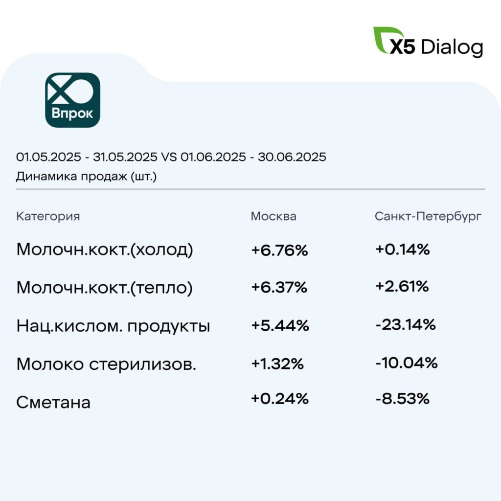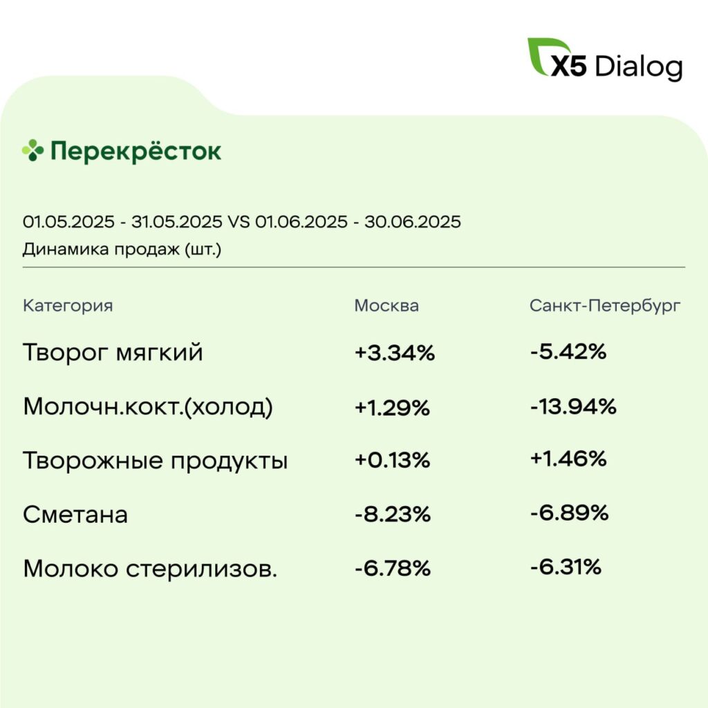 Молочная категория остаётся одной из самых чувствительных к изменениям в покупательском поведении. Различия между регионами особенно заметны, если сравнить две крупнейшие агломерации — Москву и Санкт-Петербург. С помощью сервиса Dialog X5 / Analytics мы изучили динамику продаж молочной продукции (в штуках) в сетях X5 за май и июнь 2025 года и выявили ключевые тенденции.