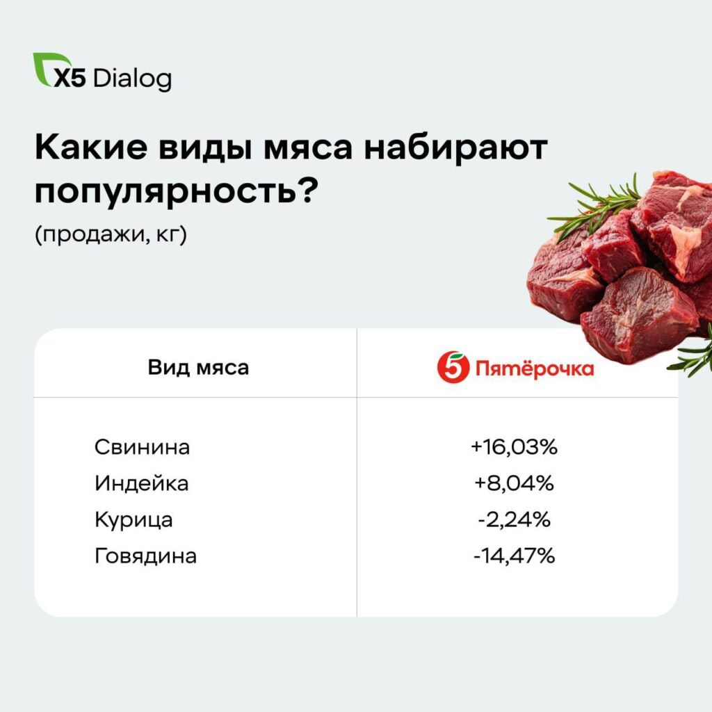 Свинина демонстрирует самую заметную положительную динамику: рост продаж составил 16,03 %. Этот результат показывает восстановление интереса к категории и стабильный спрос на продукты, которые остаются привычной частью рациона покупателей.